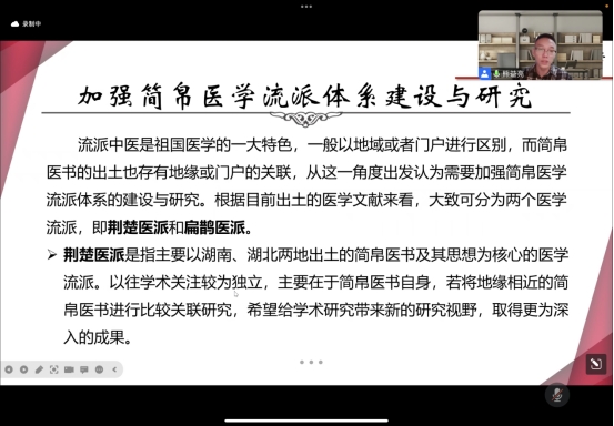 熊教授随后提出了“简帛医学流派体系”的建设与研究,将简帛医书按照出土地域进行比较研究和关联研究,将“简帛医学”的出土与医学流派的流传进行考证,以《天回医简》为例,通过对《天回医简》的研究侧面考证了“扁鹊医派”的现实性。