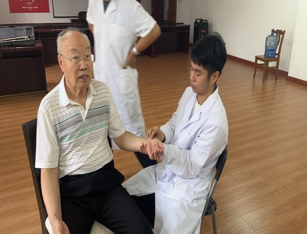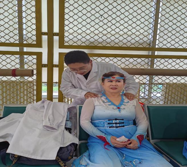 义诊过程中,同学们积极发挥自身所学,利用脉诊技术诊察居民的身体状况,并指导大家如何进行中医养生,同时利用推拿技术为居民进行肌肉放松,缓解其肌肉劳损、疼痛等症状。